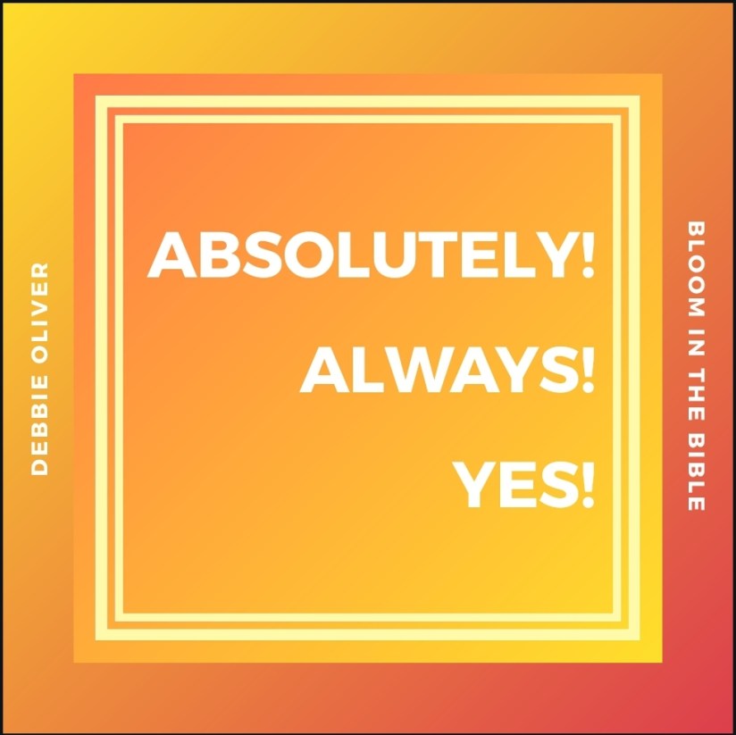 Why else would I give endlessly to others and not myself? Why else would I prioritize everything and everybody over my relationship with Jesus Christ? Do you have an Absolutely, Always, and Yes of your own?